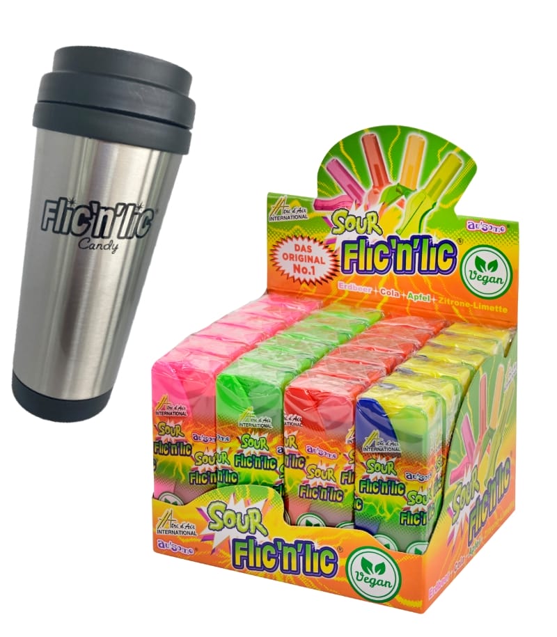 Erhältlich im platzsparenden impulsstarken Display mit 24 Stück Klapplutschern Flic’n’Lic